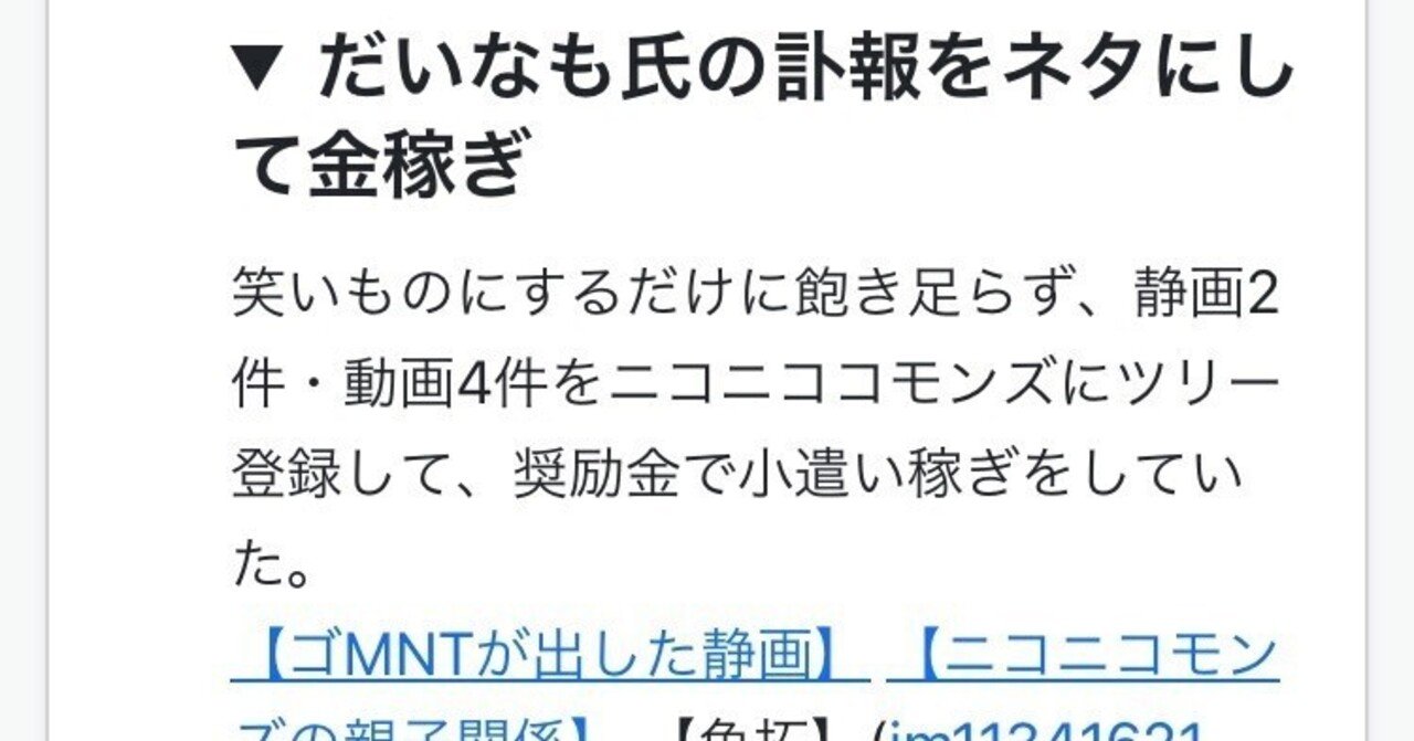 野獣大百科側が「ゴMNTはこういう奴ですよー」と印象操作する為に作られた『ゴMNT悪行一覧』ページ 今回追加されたのが クッキー☆関係者の孤独死をネタに金稼いでる!と言い張ってます。 簡単に言うと自分の作品を、複垢で紹介して収益を得ていると言うのが大百科側の主張 もうこの時点でツッコミどころが多すぎる! 分かりきってるかもしれないが初めて小生のブログを読んでる人にも分かりやすく1つずつ説明していこう。 野獣大百科のガバガバ主張 1️⃣だいなも関係ねぇ ゴMNTが投稿してる静画を挙げているこれは クッキー☆のキッズが特撮動